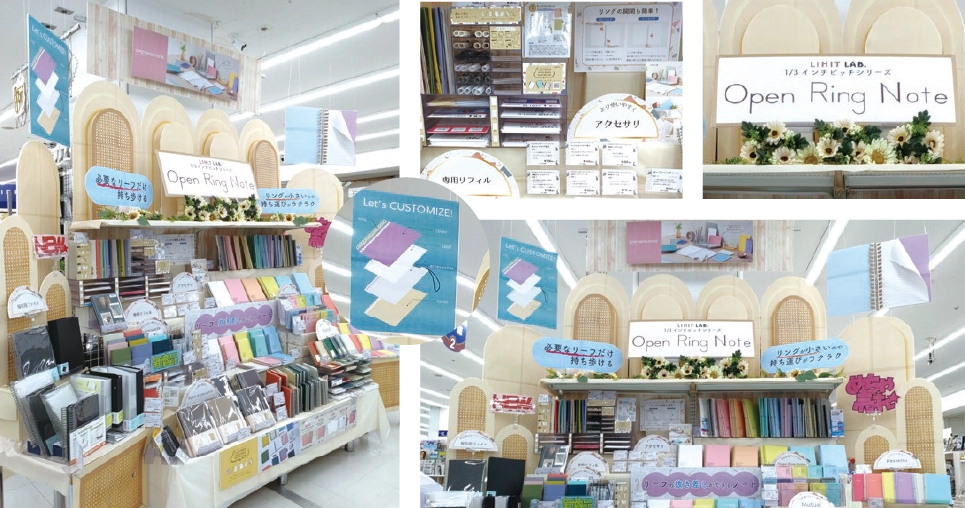 天井から吊り下げられたオープンリングノート型のPOPと「Let’s CUSTOMIZE!」と書かれたPOPが遠くからでも目を引きます。ターゲット層を意識した、韓国インテリア風のアーチ型装飾を重ねて配置することで、視覚的に立体感を持たせた演出がとても印象的です。また、装飾が全体的にナチュラルカラーでまとめられ、商品のポップなカラーが引き立つ展示になっていると感じました。カスタムできる楽しさも伝わってきますので、思わず手に取ってしまいたくなる素晴らしい展示だと思い、グランプリに選出させていただきました。「OPEN RING NOTE」下部に装飾されている「ひまわりの花」も季節感があり、魅力的でした。