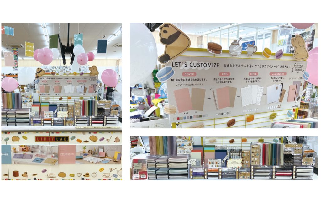 見た瞬間に「かわいい」と感じる印象的な陳列で、天井から吊るされたカラフルなオープンリングノートPOPや風船、動物、マカロンなどの装飾が目を引きます。目線の位置にある「LET'S CUSTOMISE」の図説POPに合わせて商品が陳列されているので、説明を見ながら商品を手に取って確認する事ができる、非常に分かりやすい展示構成になっており、工夫が凝らされていると感じました。消費者の目線に立って考えられた、すごく素敵な売り場です。