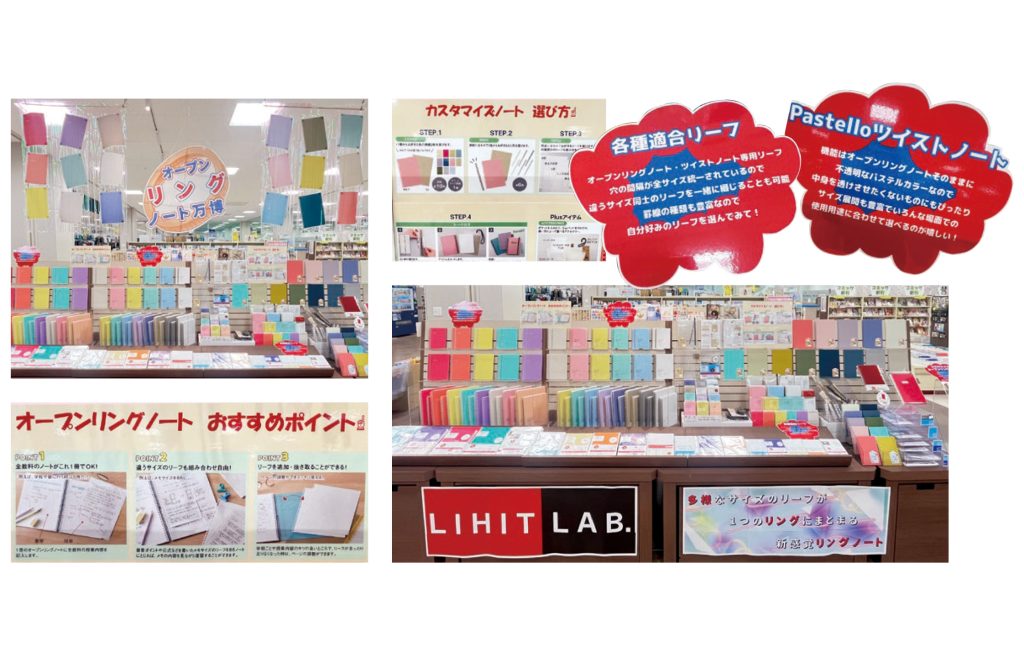 まず目を引くのが、天井から吊り下げられた「オープンリングノート」のラインナップ。この展示方法は斬新で、色展開も一目瞭然。まさに「オープンリングノート万博」コンセプトにふさわしい展示となっています。オリジナルのキャッチフレーズ『多様なサイズのリーフが1つのリングにまとまる新感覚リングノート』も、オープンリングノートの特徴をわかりやすく伝えています。また、大阪で開催中のイベントをイメージしたメインPOPや、赤と青の配色が非常に目を引く各種説明POPが、訴求力のあるPOPとなっている点で評価させていただきました。