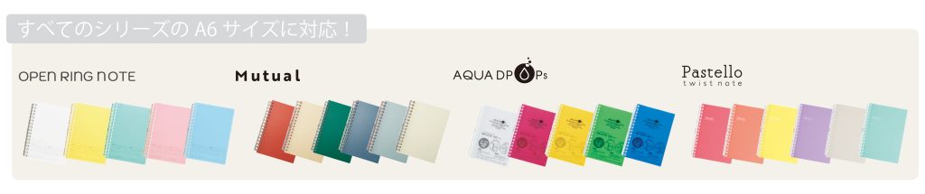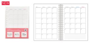 『オープンリングノート』シリーズは、とじ具が開いてリーフを交換・追加できる特長のノートとして、2009年発売以降、様々なシリーズ商品を発売してきたロングセラーシリーズです。マンスリーリーフは、A5サイズのみラインナップしておりましたが、差し換えできることを有効に利用いただいているA6サイズをお使いのお客様に待望のマンスリーリーフが登場。既発売のリーフや、「カスタマイズオープンリングノート」シリーズのアクセサリーと組み合わせることで自分好みにカスタマイズできる幅がさらに広がりました。既発売のノートシリーズ『AQUA DROPs』(アクア・ドロップス)や『Pastello』(パステロ)、『Mutual』(ミューチュアル)をはじめとする、1/3インチピッチ(ISO規格)を採用したシリーズ全てに対応。 |