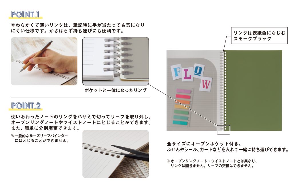 Soffice(ソフィーチェ)は、やわらかくて薄い独自のリングが特長のノートシリーズです。リングは筆記時に手が当たっても気になりにくくかさばらないので、持ち運びに便利です。手に取りやすい落ち着いた色合いとなっており、若年層からビジネスパーソンまで幅広く使える色合いです。メモ、A6、A5、セミB5のすべてのサイズにオープンポケットが付いており、ふせんやシール、カード等が収納できる仕様です。