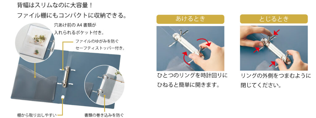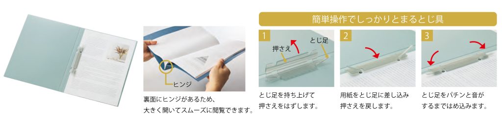 | 紙おさえと、とじ足が一体化した使いやすいデザイン |