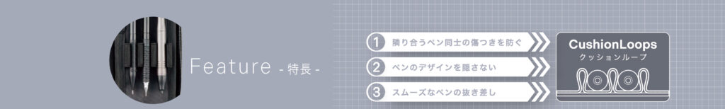 ペン同士が当たらず傷付かないクッションループを、すべてのペンケースに採用しています。 |