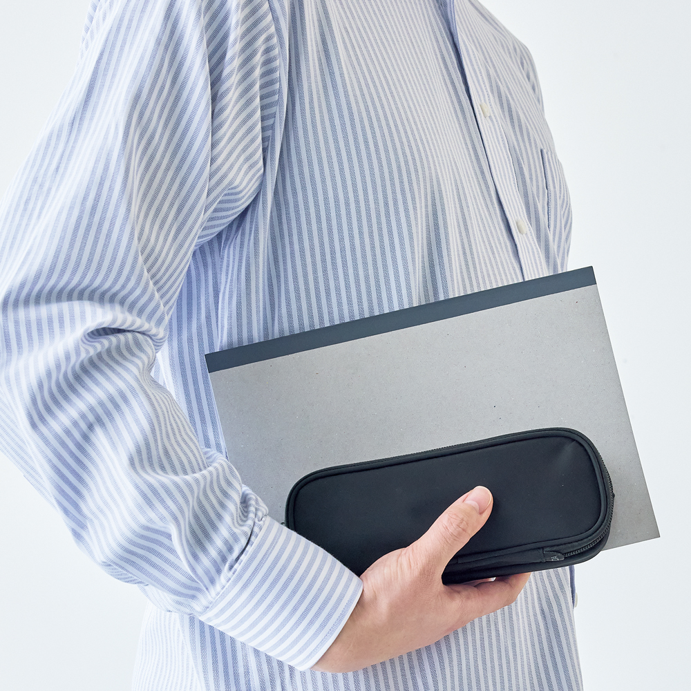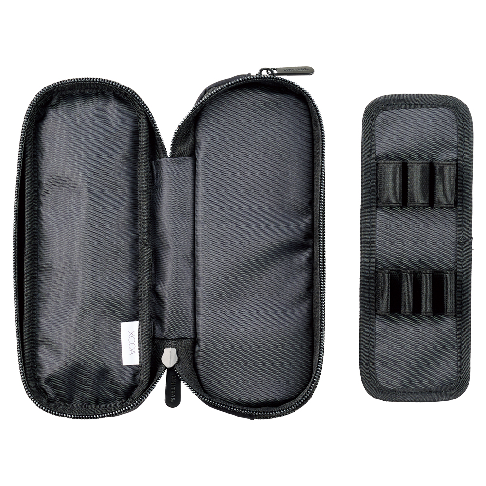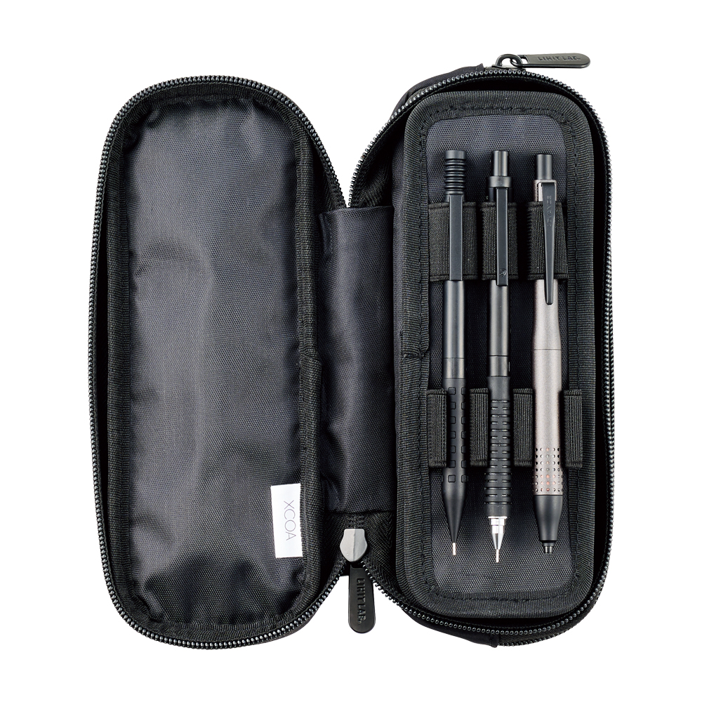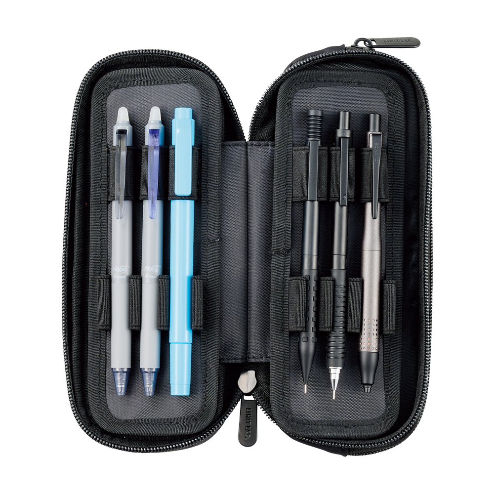 ペンを見開きで一覧できるスプレッド型と様々な小物を自由に収納できるポーチが一体となったペンケース。
