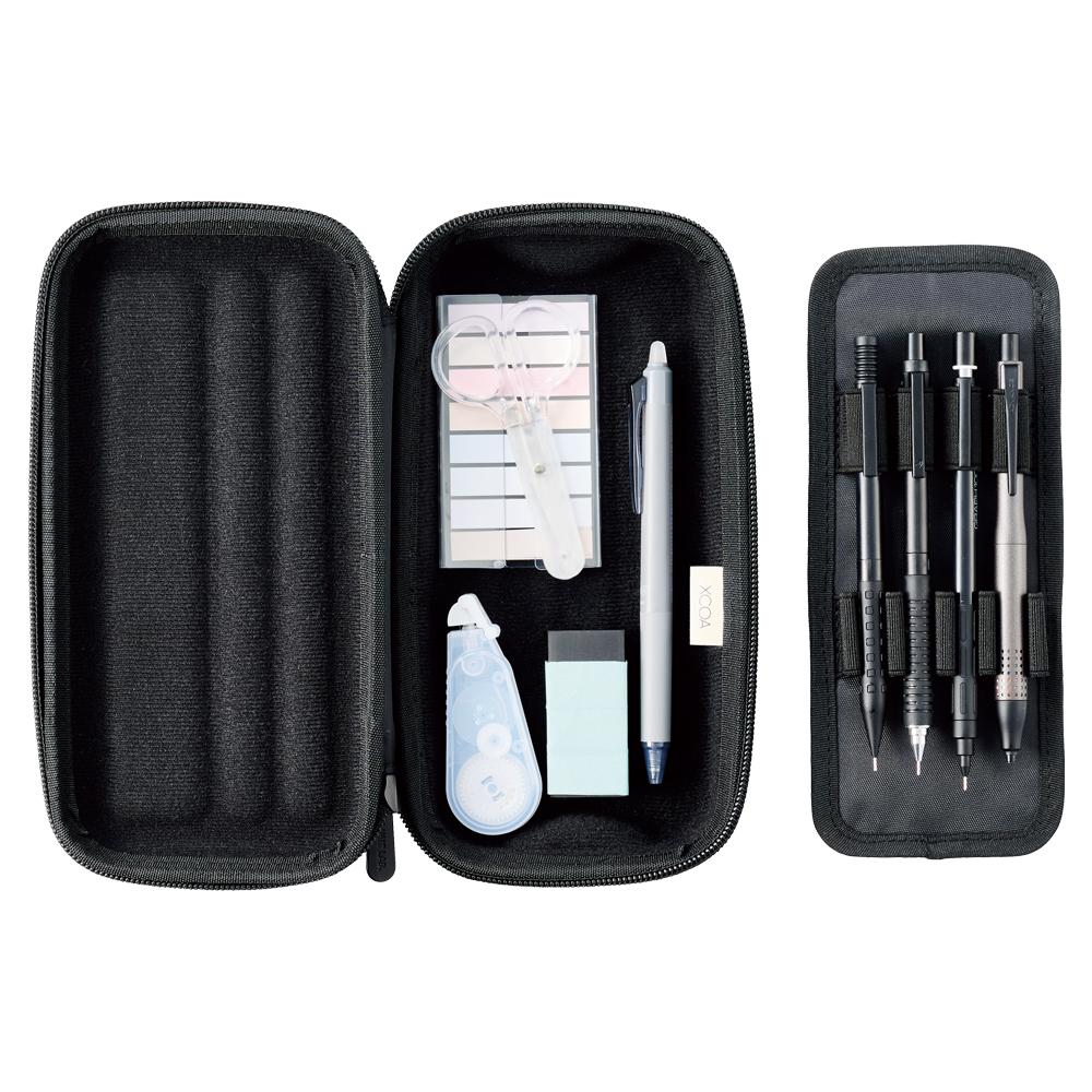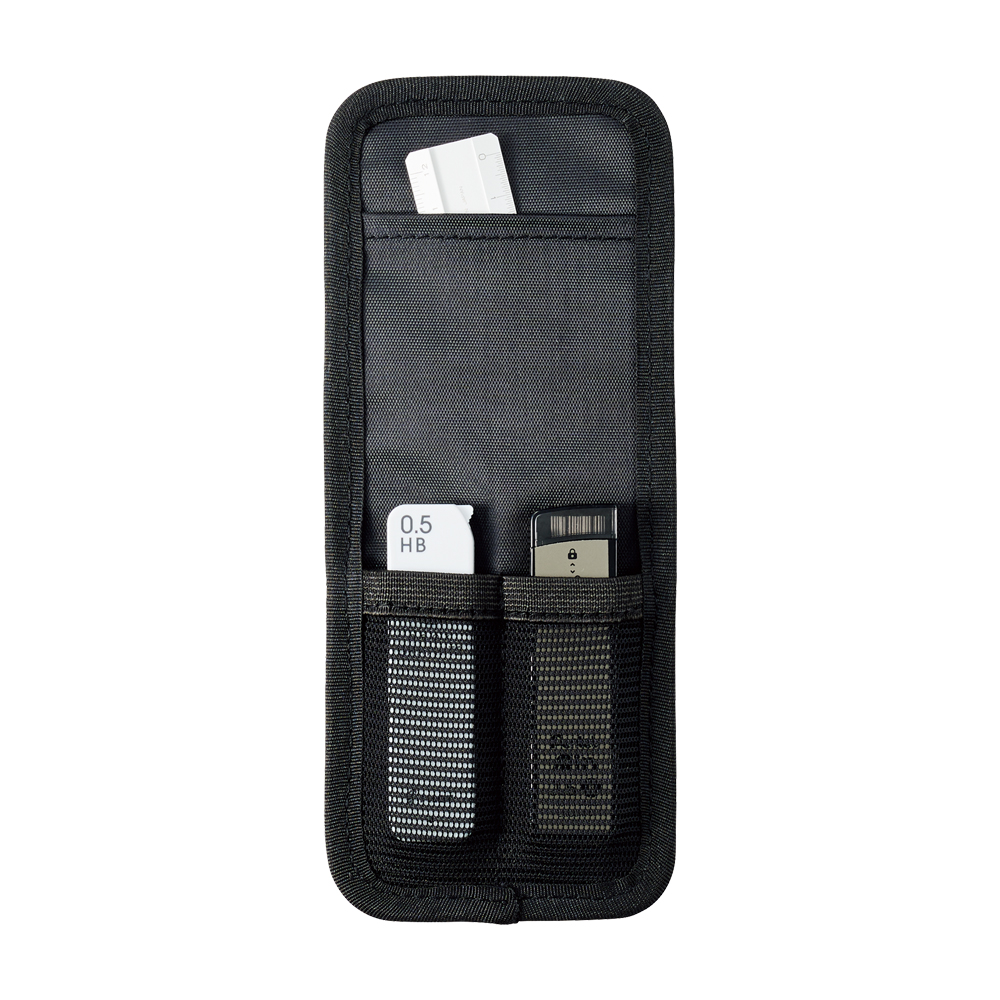 ペンホルダープレートの裏面ポケットには定規、メッシュポケットはシャープ替芯を入れられます。