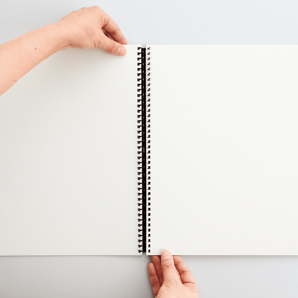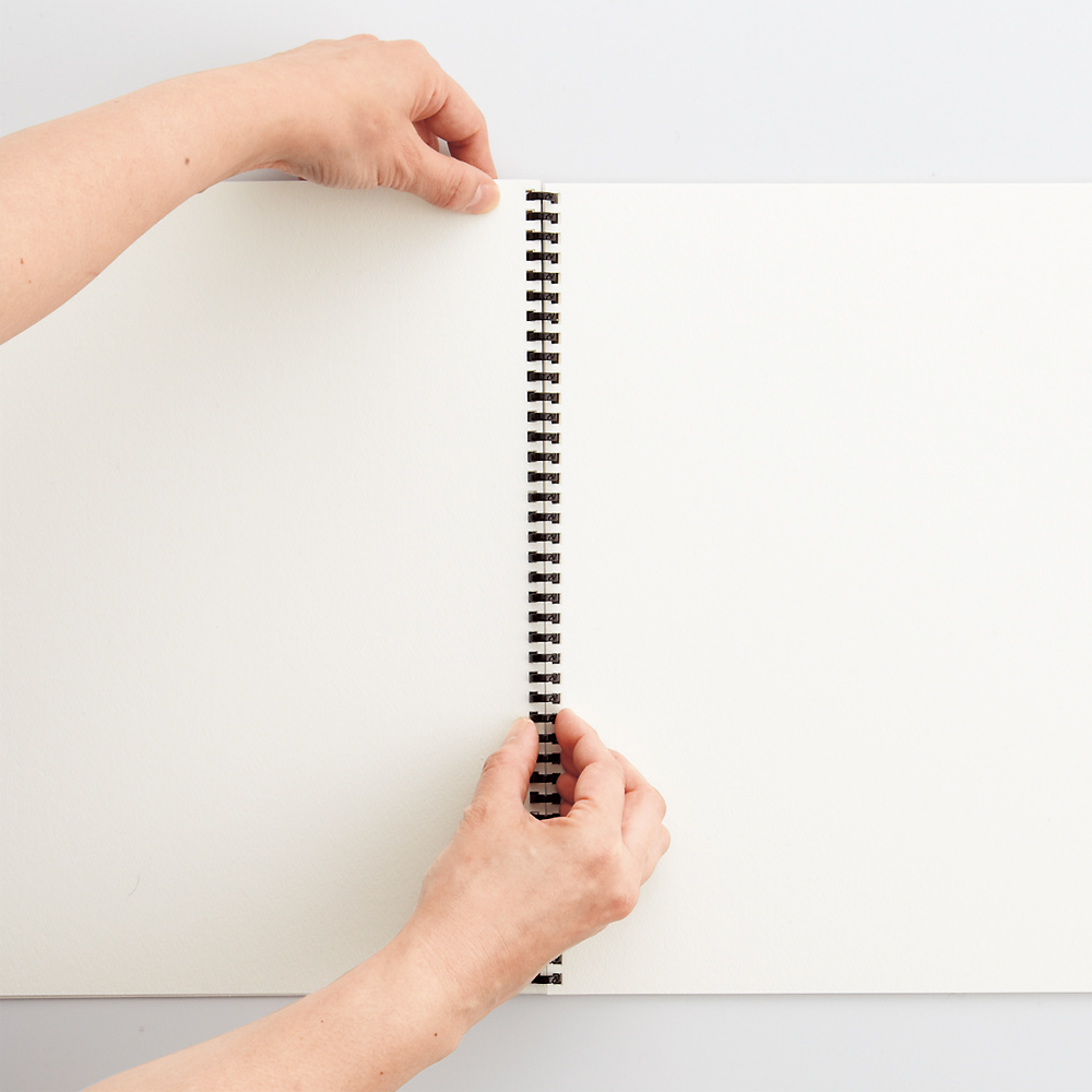 | 材質 | オモテ表紙/ポリプロピレン(生地厚0.6mm)、裏表紙/板紙、とじ具/ポリカーボネート、用紙/水彩画用紙(300g/m2) |