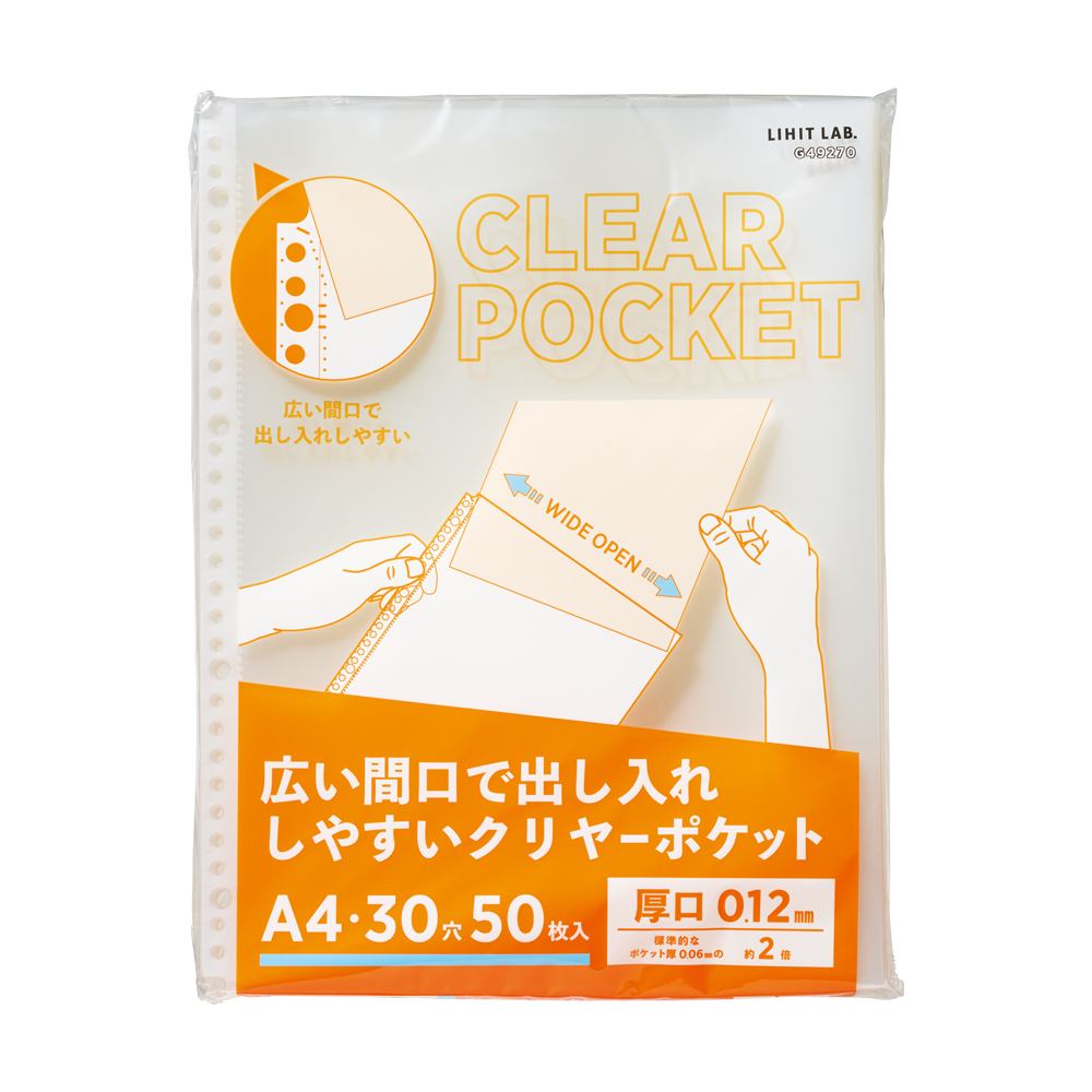 A4・30穴、生地厚0.12mmのトップインタイプのクリヤーポケットです。