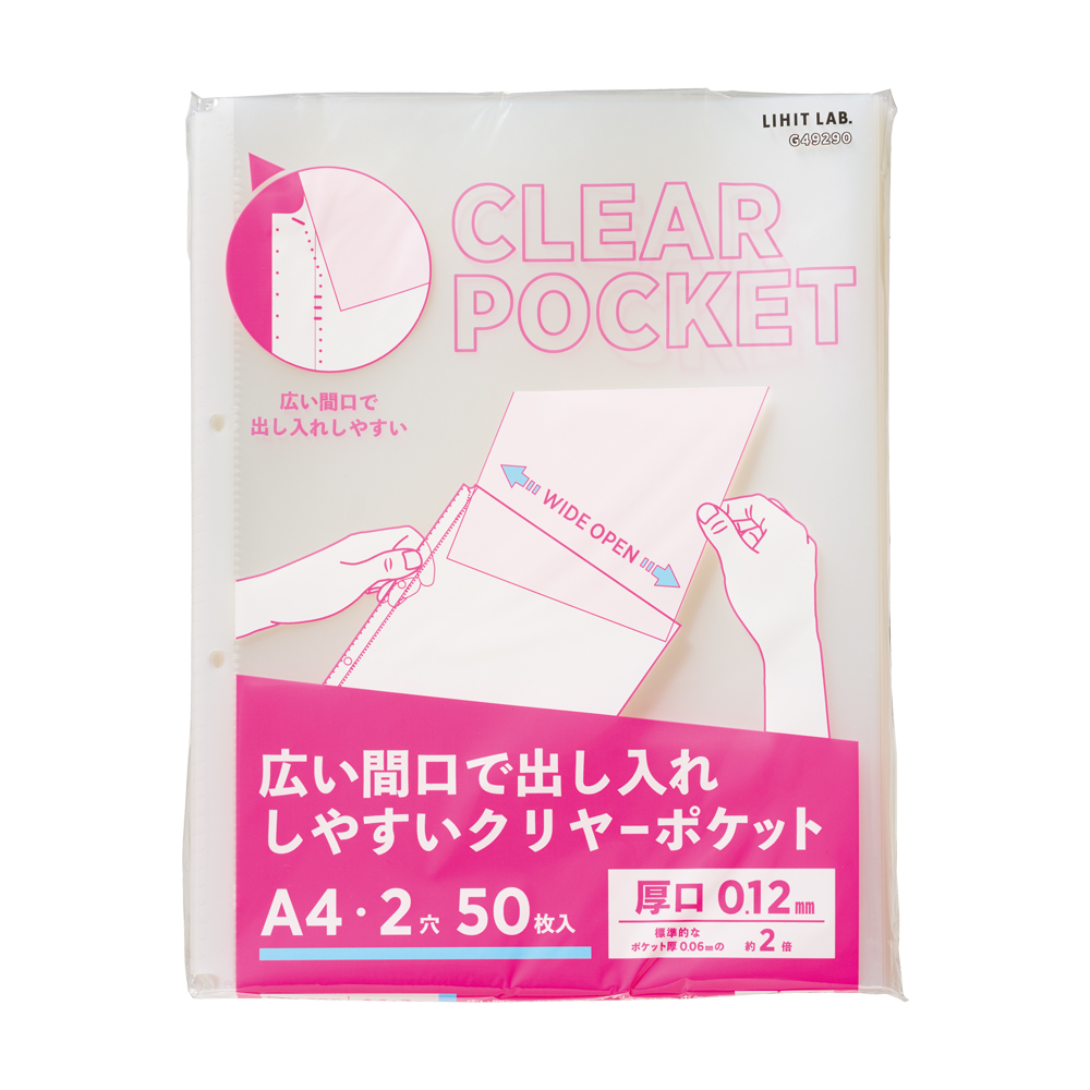 A4・2穴、生地厚0.12mmのトップインタイプのクリヤーポケットです。