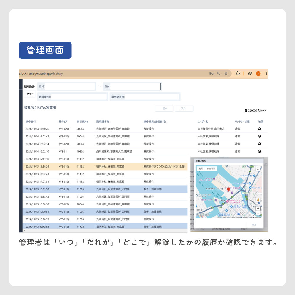 「いつ」「誰が」「どこで」開錠したかの履歴が残り、管理者はWEB上で確認できます。