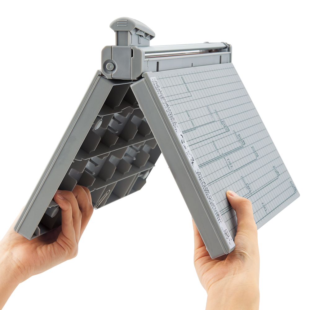 折りたたみ式のコンパクトサイズ。切りやすくブレにくい2枚の回転刃搭載。※直線刃のみ