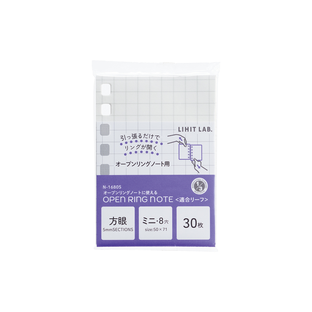リングを開いて、リーフの抜き差し・交換ができるオープンリングノート専用のミニサイズの方眼罫リーフです。
