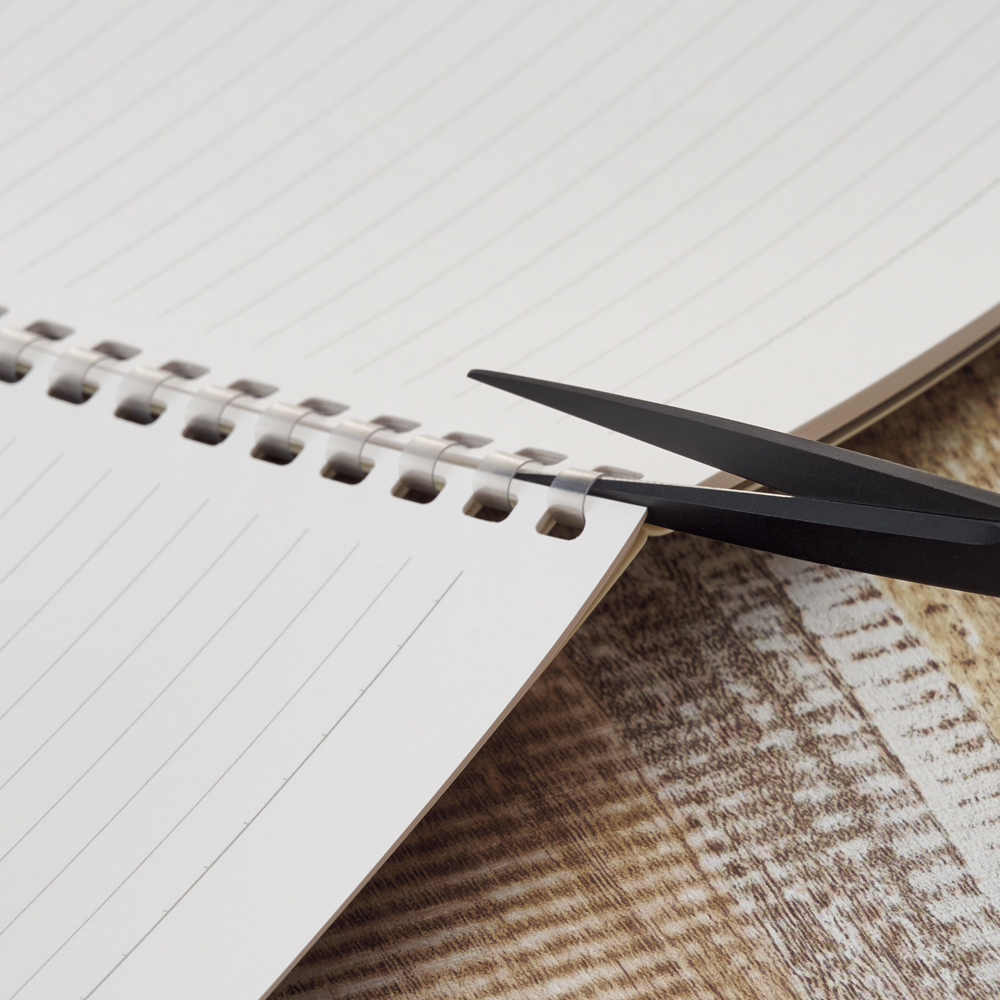 使い終わったノートのリングをハサミで切ってリーフを取り外し、オープンリングノートやツイストノートにとじることができます。